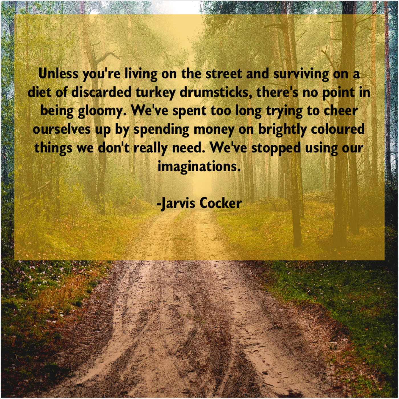 “Unless you’re living on the street and surviving on a diet of discarded turkey drumsticks, there’s no point in being gloomy. We’ve spent too long trying to cheer ourselves up by spending money on brightly coloured things we don’t really need. We’ve stopped using our imaginations.”