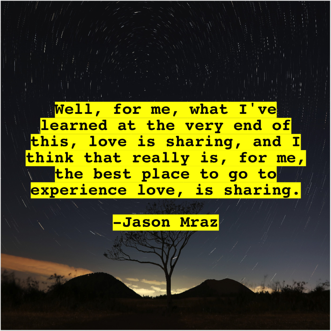Jason Mraz Jason Mraz – Well, for me, what I’ve… August 13, 2019 admin “Well, for me, what I’ve learned at the very end of this, love is sharing, and I think that really is, for me, the best place to go to experience love, is sharing.”-Jason Mraz