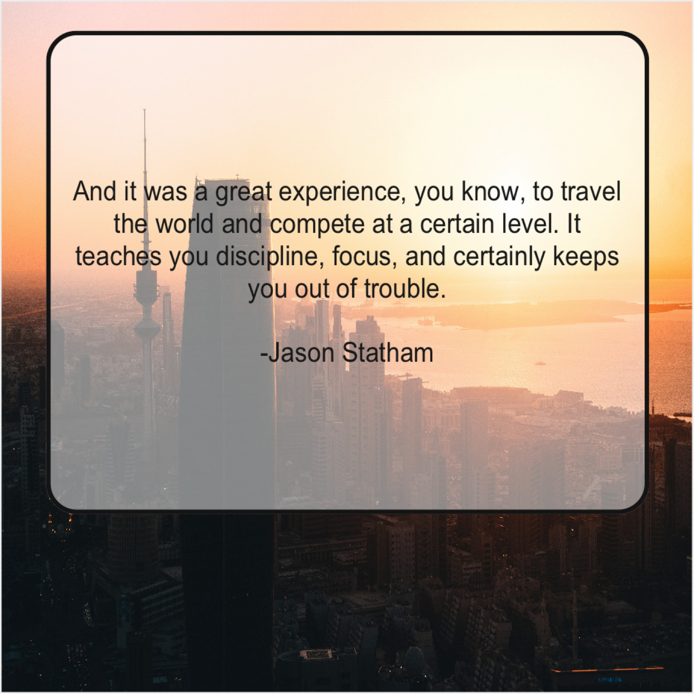 Jason Statham Jason Statham – And it was a great… July 27, 2019 admin “And it was a great experience, you know, to travel the world and compete at a certain level. It teaches you discipline, focus, and certainly keeps you out of trouble.”-Jason Statham