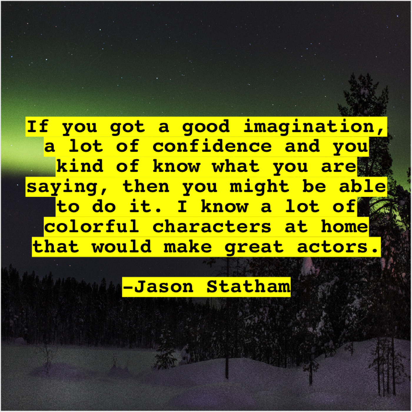 Jason Statham Jason Statham – If you got a good… December 26, 2018 admin “If you got a good imagination, a lot of confidence and you kind of know what you are saying, then you might be able to do it. I know a lot of colorful characters at home that would make great actors.”-Jason Statham