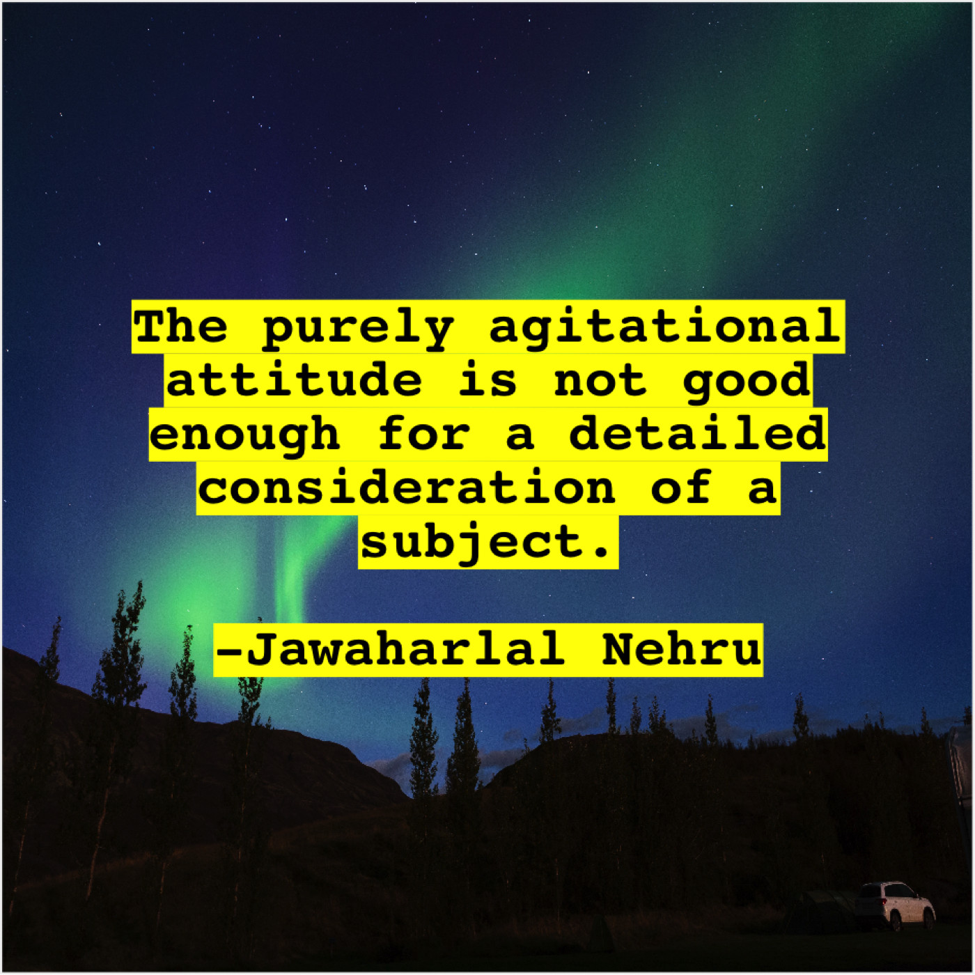 Jawaharlal Nehru Jawaharlal Nehru – The purely agitational attitude is… January 30, 2019 admin “The purely agitational attitude is not good enough for a detailed consideration of a subject.”-Jawaharlal Nehru
