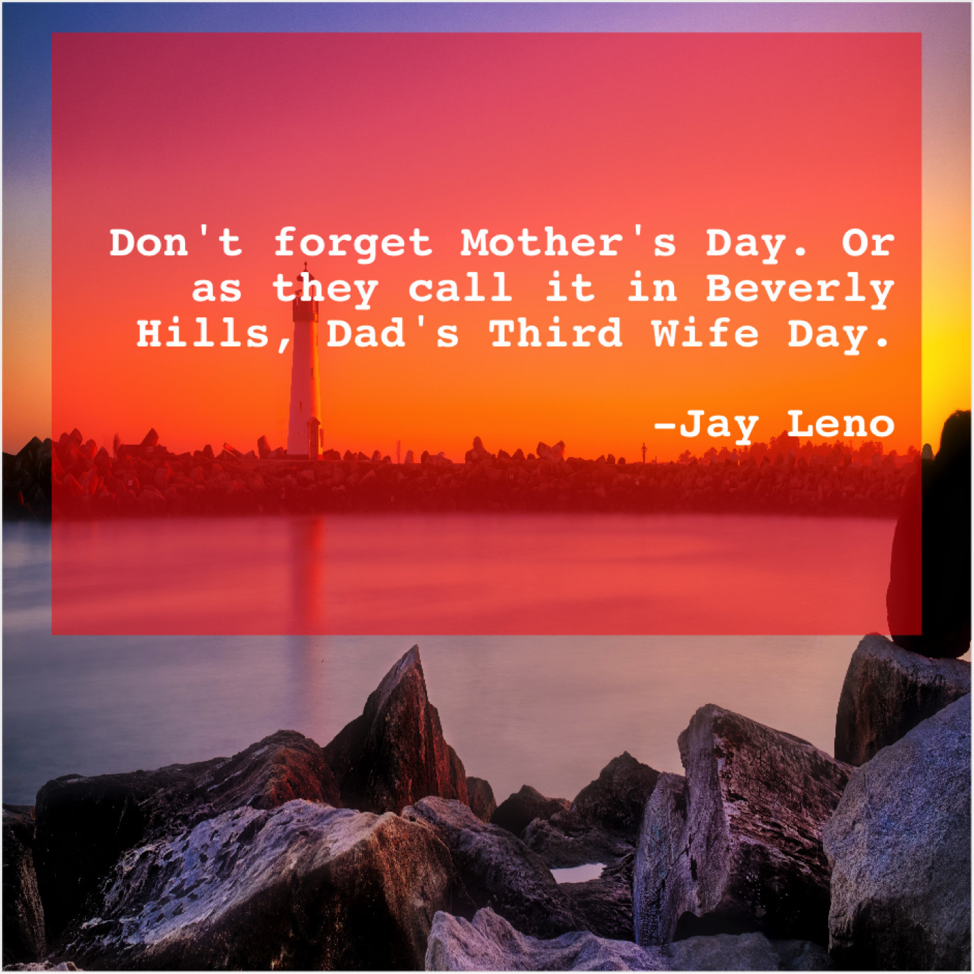 Jay Leno Jay Leno – Don’t forget Mother’s Day. Or… December 25, 2018 admin “Don’t forget Mother’s Day. Or as they call it in Beverly Hills, Dad’s Third Wife Day.”-Jay Leno