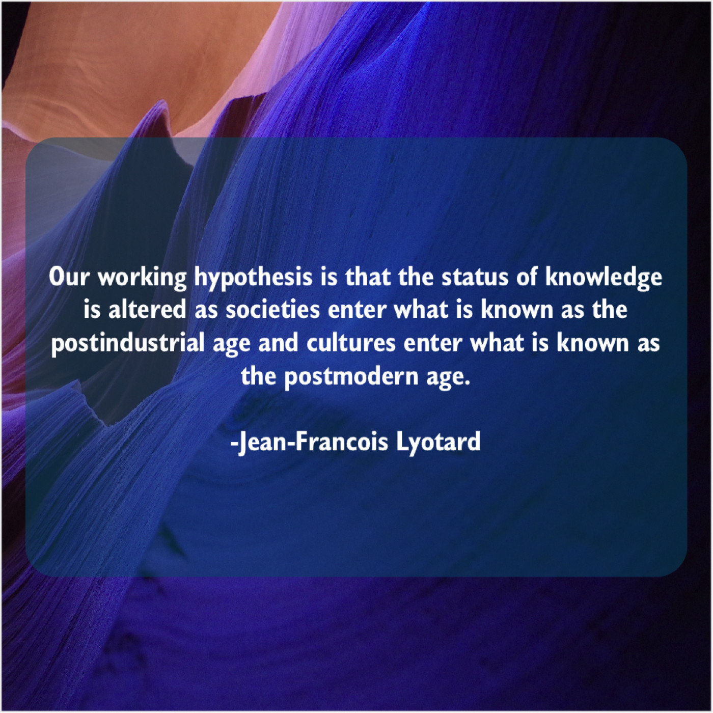 Jean-Francois Lyotard Jean-Francois Lyotard – Our working hypothesis is that… September 15, 2019 admin “Our working hypothesis is that the status of knowledge is altered as societies enter what is known as the postindustrial age and cultures enter what is known as the postmodern age.”-Jean-Francois Lyotard