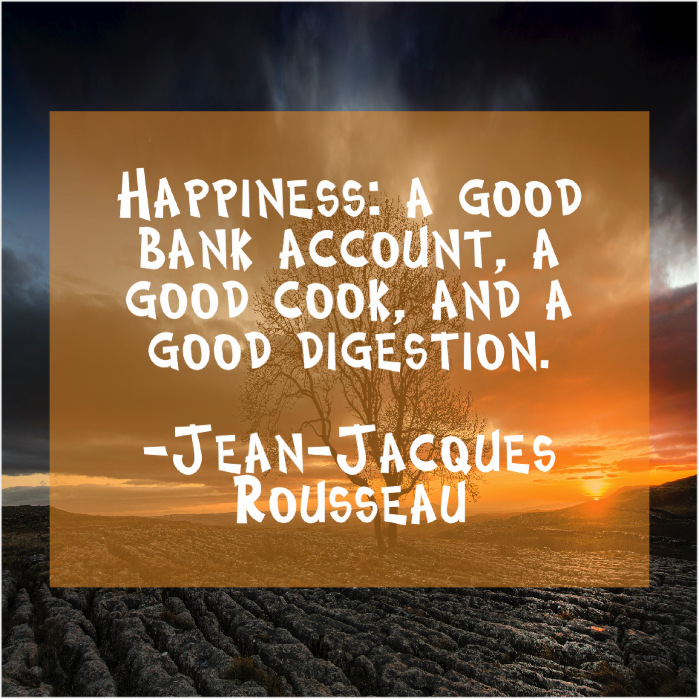Jean-Jacques Rousseau Jean-Jacques Rousseau – Happiness: a good bank account… February 10, 2019 admin “Happiness: a good bank account, a good cook, and a good digestion.”-Jean-Jacques Rousseau