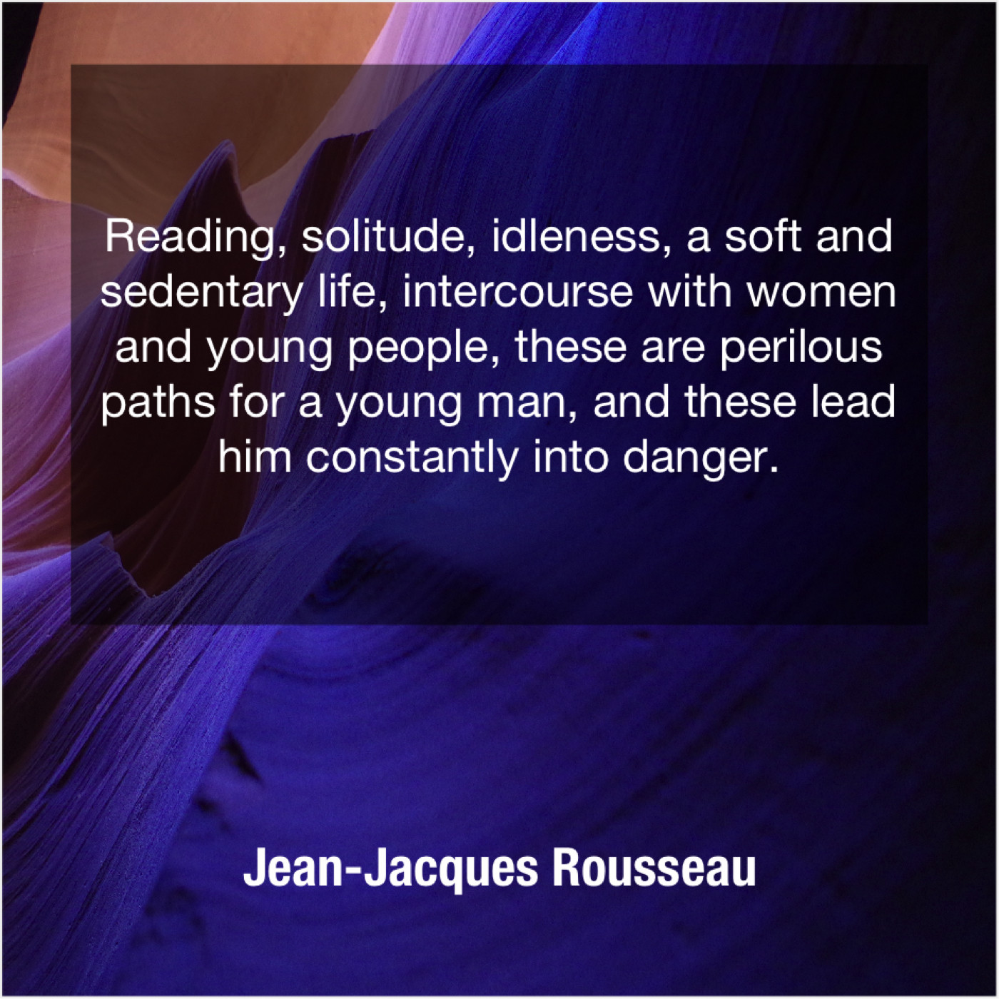 Jean-Jacques Rousseau Jean-Jacques Rousseau – Reading, solitude, idleness, a soft… April 23, 2019 admin “Reading, solitude, idleness, a soft and sedentary life, intercourse with women and young people, these are perilous paths for a young man, and these lead him constantly into danger.”-Jean-Jacques Rousseau