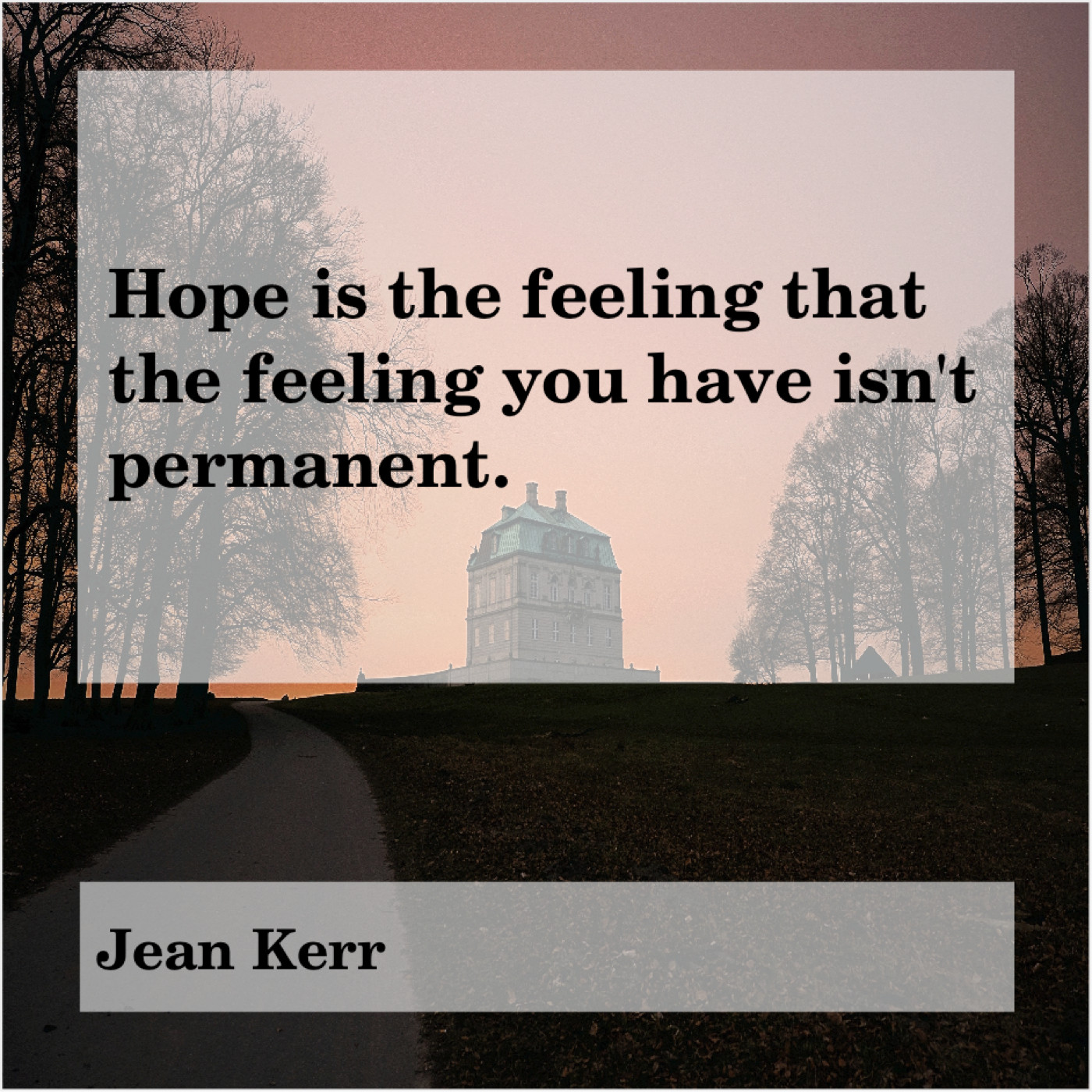 Jean Kerr Jean Kerr – Hope is the feeling that… September 10, 2019 admin “Hope is the feeling that the feeling you have isn’t permanent.”-Jean Kerr