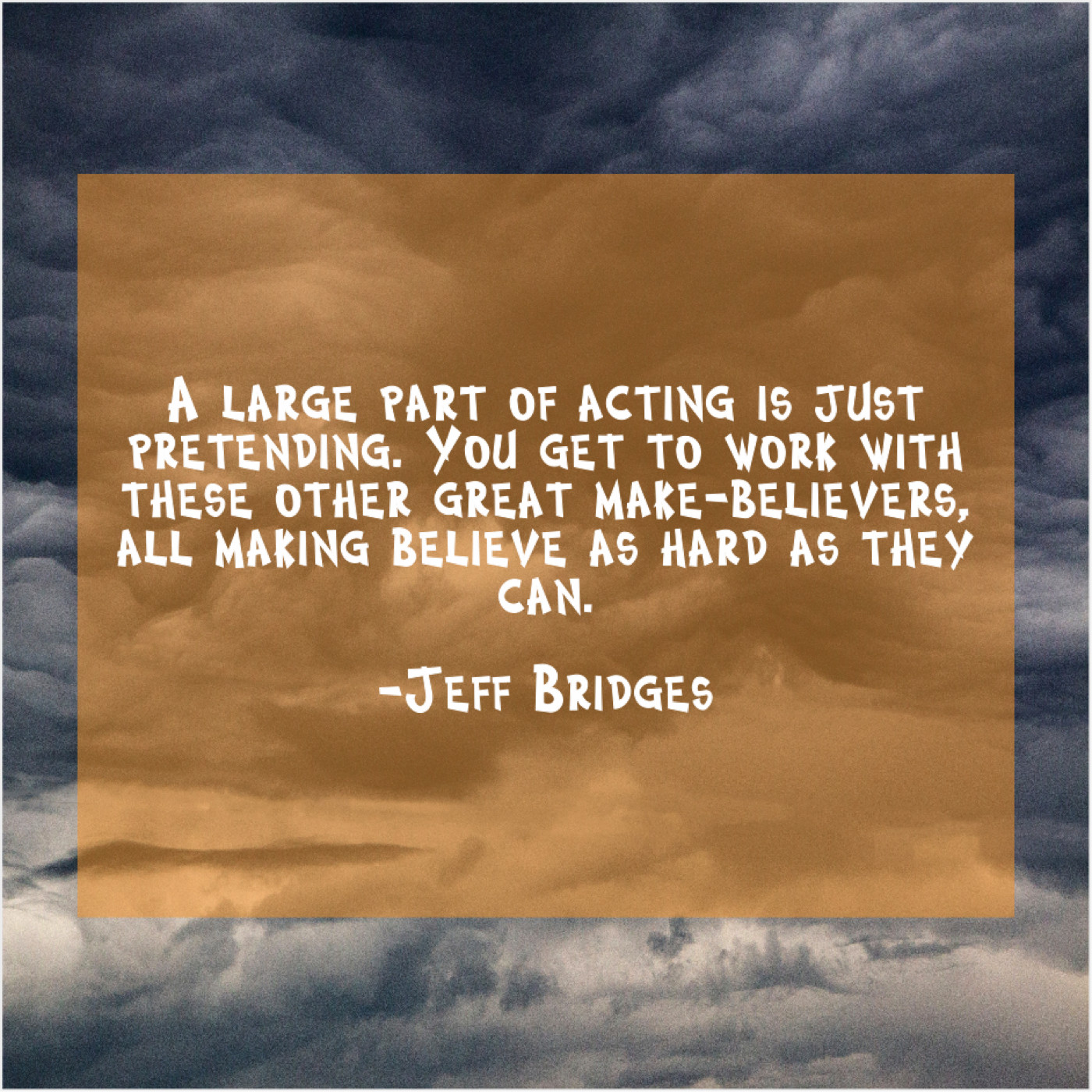 Jeff Bridges Jeff Bridges – A large part of acting… July 29, 2019 admin “A large part of acting is just pretending. You get to work with these other great make-believers, all making believe as hard as they can.”-Jeff Bridges