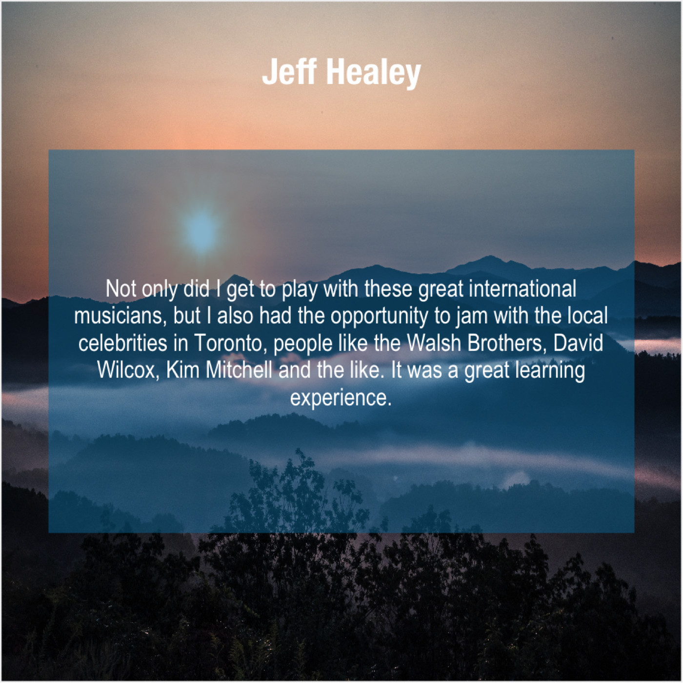 “Not only did I get to play with these great international musicians, but I also had the opportunity to jam with the local celebrities in Toronto, people like the Walsh Brothers, David Wilcox, Kim Mitchell and the like. It was a great learning experience.”