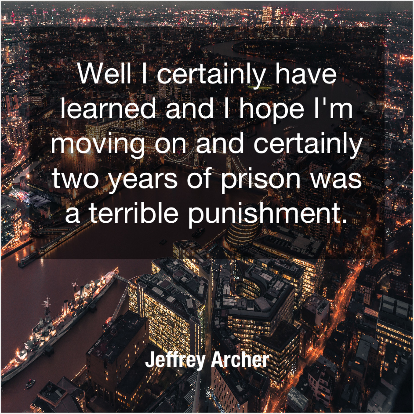 Jeffrey Archer Jeffrey Archer – Well I certainly have learned… March 25, 2019 admin “Well I certainly have learned and I hope I’m moving on and certainly two years of prison was a terrible punishment.”-Jeffrey Archer