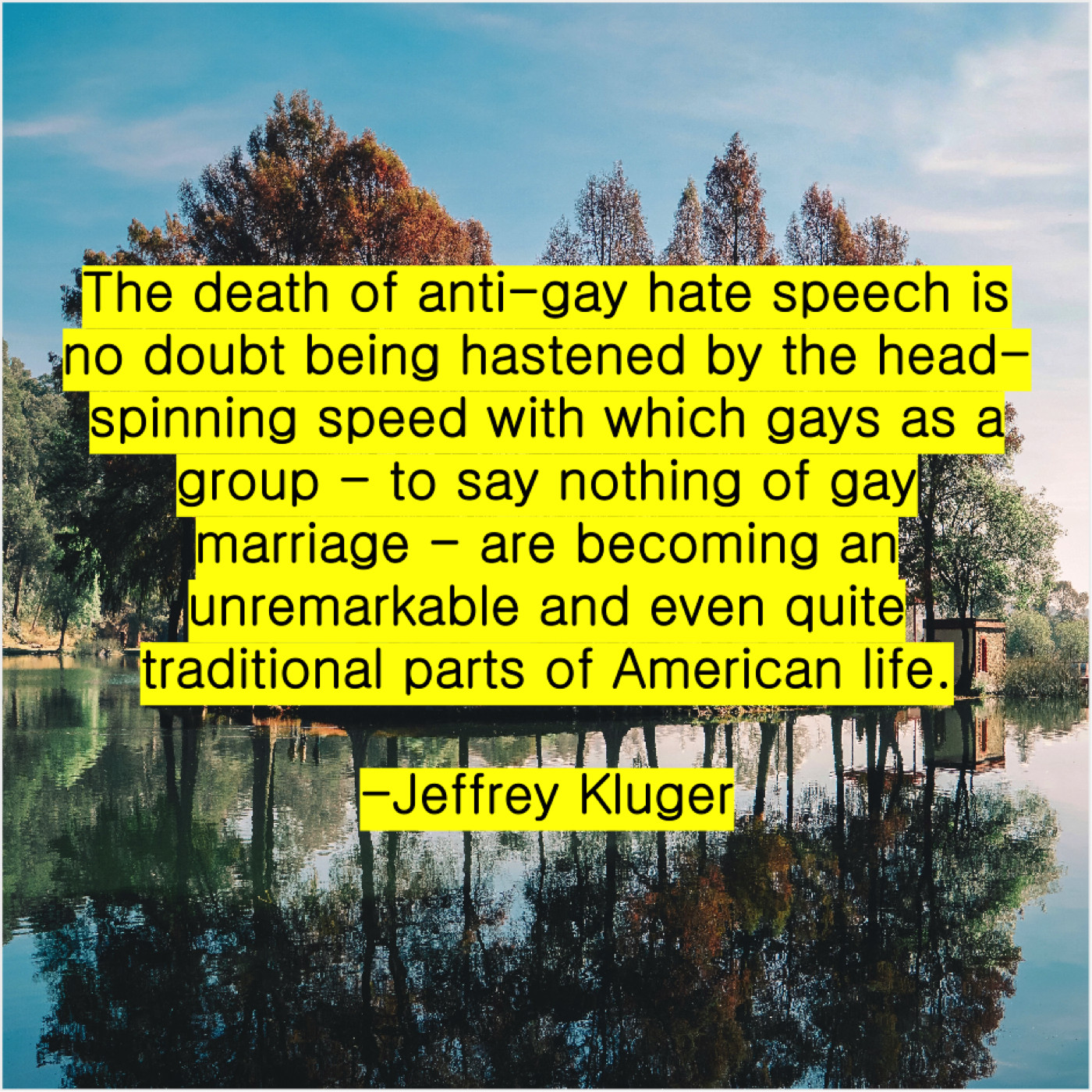 Jeffrey Kluger Jeffrey Kluger – The death of anti-gay… March 8, 2019 admin “The death of anti-gay hate speech is no doubt being hastened by the head-spinning speed with which gays as a group – to say nothing of gay marriage – are becoming an unremarkable and even quite traditional parts of American life.”-Jeffrey Kluger