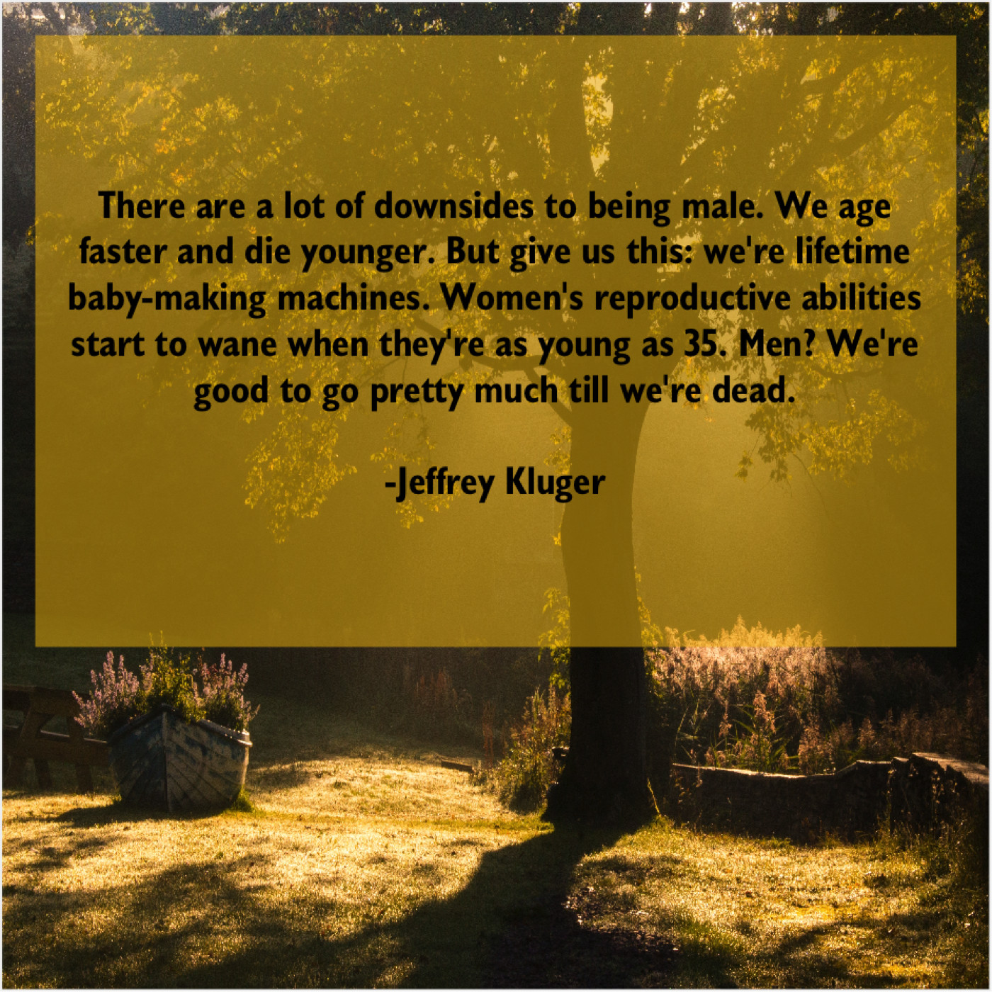 “There are a lot of downsides to being male. We age faster and die younger. But give us this: we’re lifetime baby-making machines. Women’s reproductive abilities start to wane when they’re as young as 35. Men? We’re good to go pretty much till we’re dead.”