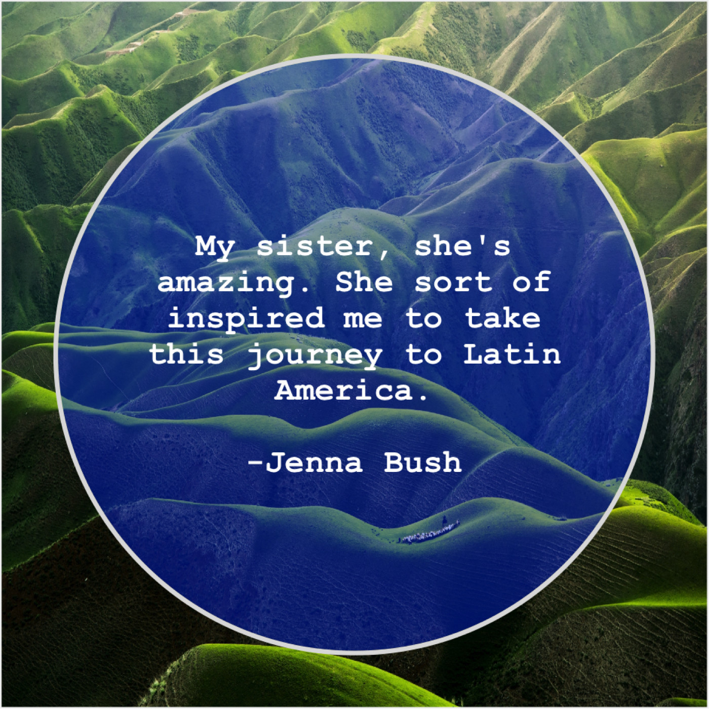 Jenna Bush Jenna Bush – My sister, she’s amazing. She… October 5, 2019 admin “My sister, she’s amazing. She sort of inspired me to take this journey to Latin America.”-Jenna Bush