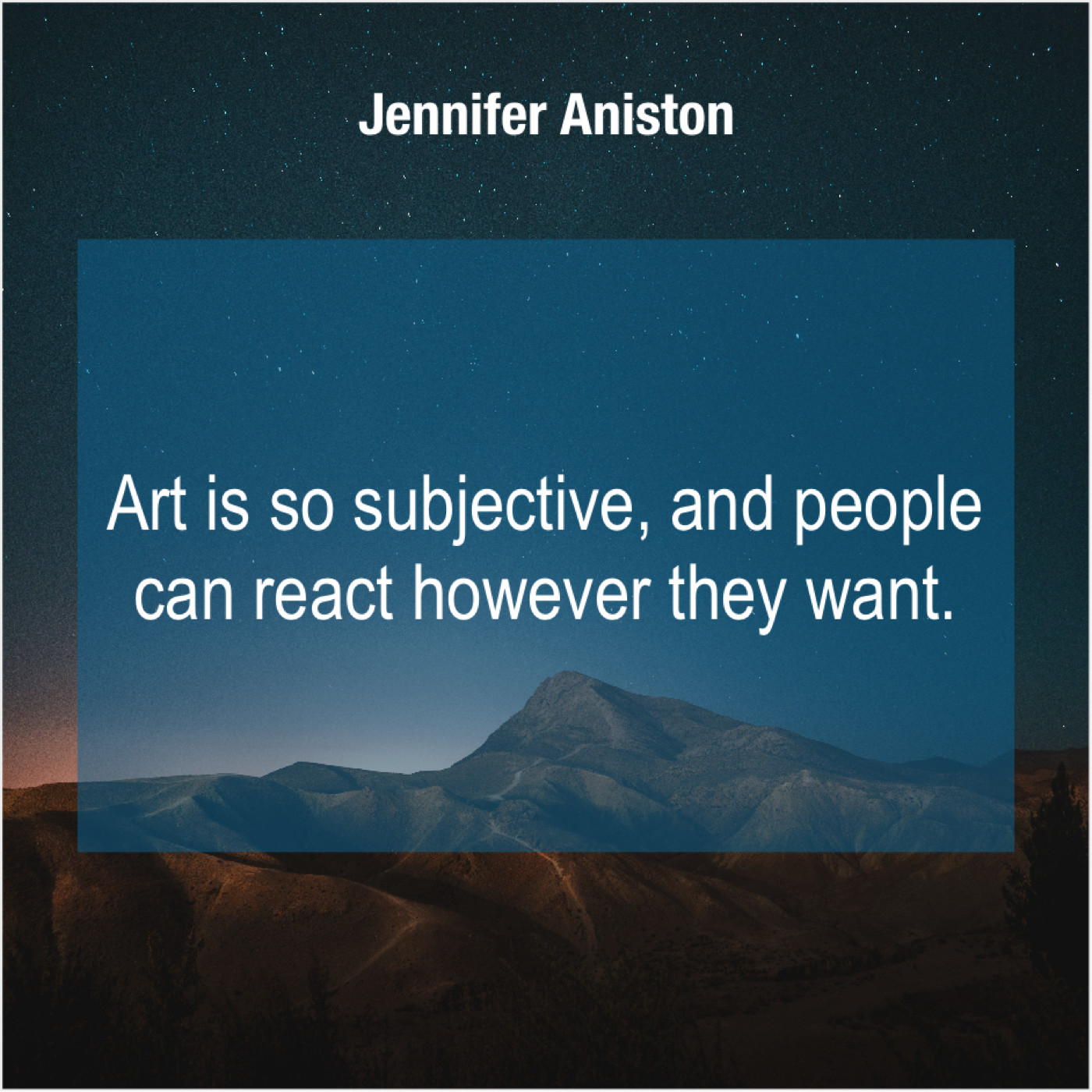 Jennifer Aniston Jennifer Aniston – Art is so subjective, and… January 19, 2019 admin “Art is so subjective, and people can react however they want.”-Jennifer Aniston