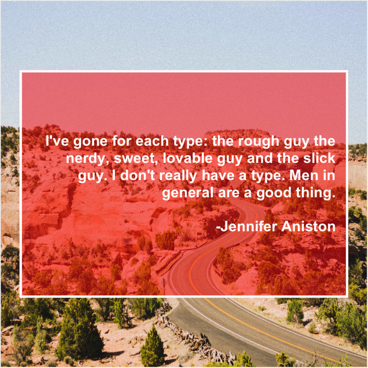 Jennifer Aniston Jennifer Aniston – I’ve gone for each type… December 3, 2018 admin “I’ve gone for each type: the rough guy the nerdy, sweet, lovable guy and the slick guy. I don’t really have a type. Men in general are a good thing.”-Jennifer Aniston