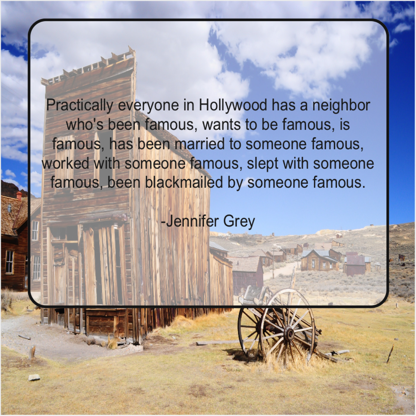 Jennifer Grey Jennifer Grey – Practically everyone in Hollywood has… February 16, 2019 admin “Practically everyone in Hollywood has a neighbor who’s been famous, wants to be famous, is famous, has been married to someone famous, worked with someone famous, slept with someone famous, been blackmailed by someone famous.”-Jennifer Grey