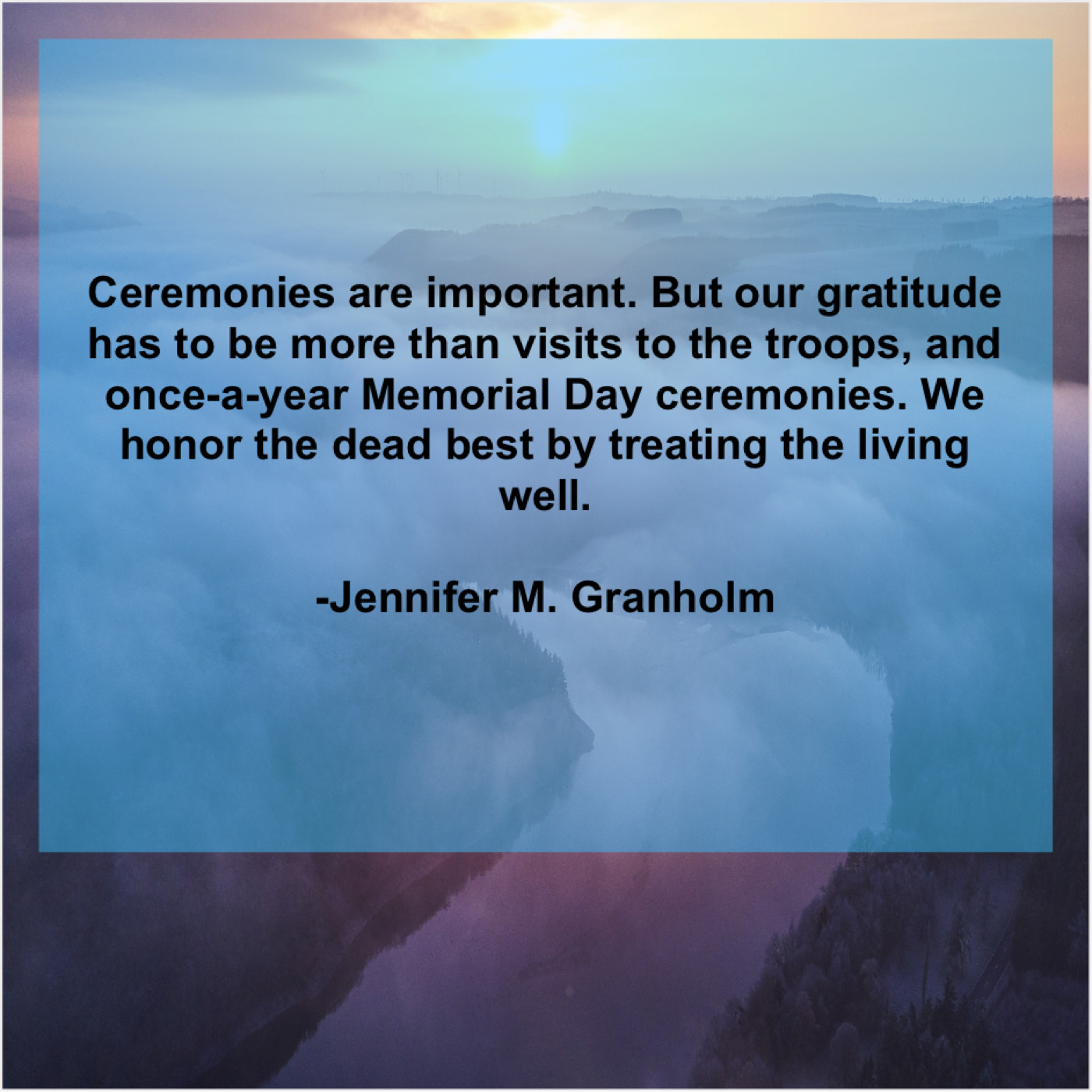 Jennifer M. Granholm Jennifer M. Granholm – Ceremonies are important. But our… March 19, 2019 admin “Ceremonies are important. But our gratitude has to be more than visits to the troops, and once-a-year Memorial Day ceremonies. We honor the dead best by treating the living well.”-Jennifer M. Granholm
