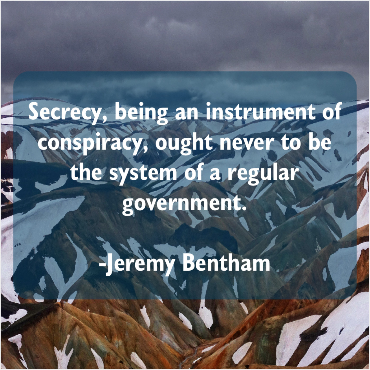 Jeremy Bentham Jeremy Bentham – Secrecy, being an instrument of… September 30, 2019 admin “Secrecy, being an instrument of conspiracy, ought never to be the system of a regular government.”-Jeremy Bentham