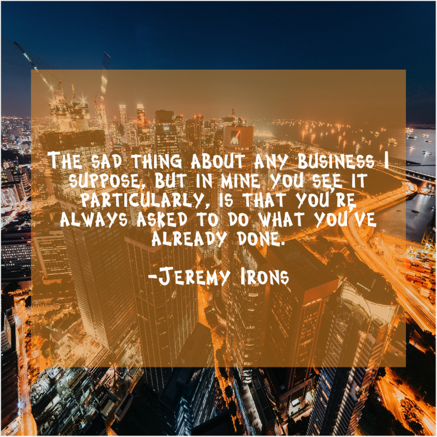 Jeremy Irons Jeremy Irons – The sad thing about any… May 12, 2019 admin “The sad thing about any business I suppose, but in mine you see it particularly, is that you’re always asked to do what you’ve already done.”-Jeremy Irons