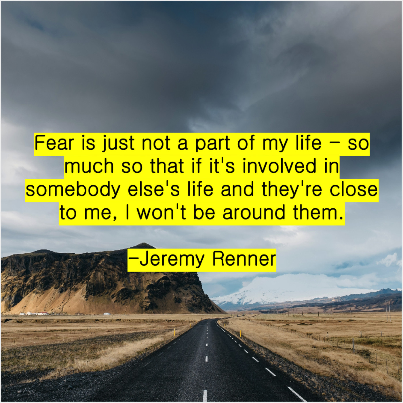 Jeremy Renner Jeremy Renner – Fear is just not a… May 25, 2019 admin “Fear is just not a part of my life – so much so that if it’s involved in somebody else’s life and they’re close to me, I won’t be around them.”-Jeremy Renner