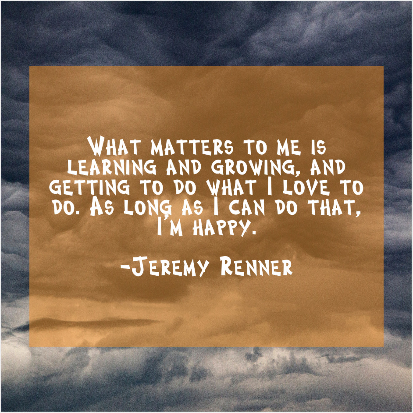 Jeremy Renner Jeremy Renner – What matters to me is… January 24, 2019 admin “What matters to me is learning and growing, and getting to do what I love to do. As long as I can do that, I’m happy.”-Jeremy Renner