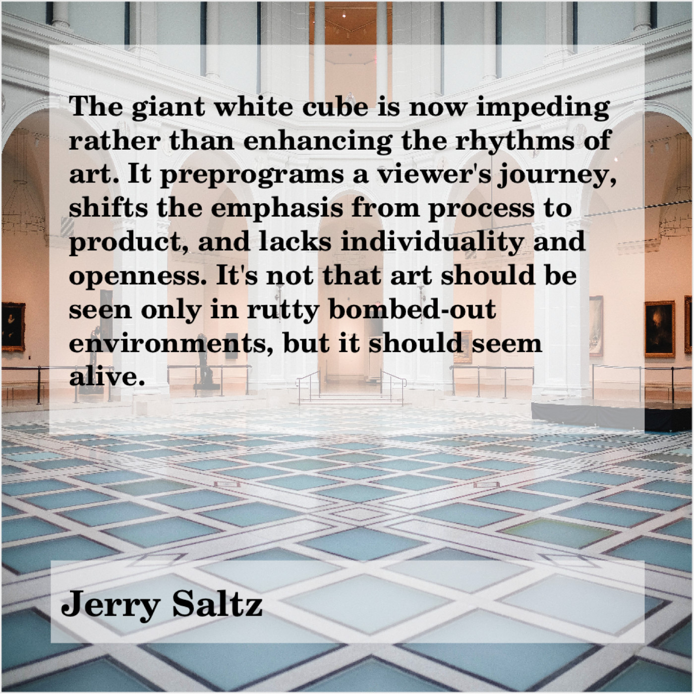 “The giant white cube is now impeding rather than enhancing the rhythms of art. It preprograms a viewer’s journey, shifts the emphasis from process to product, and lacks individuality and openness. It’s not that art should be seen only in rutty bombed-out environments, but it should seem alive.”