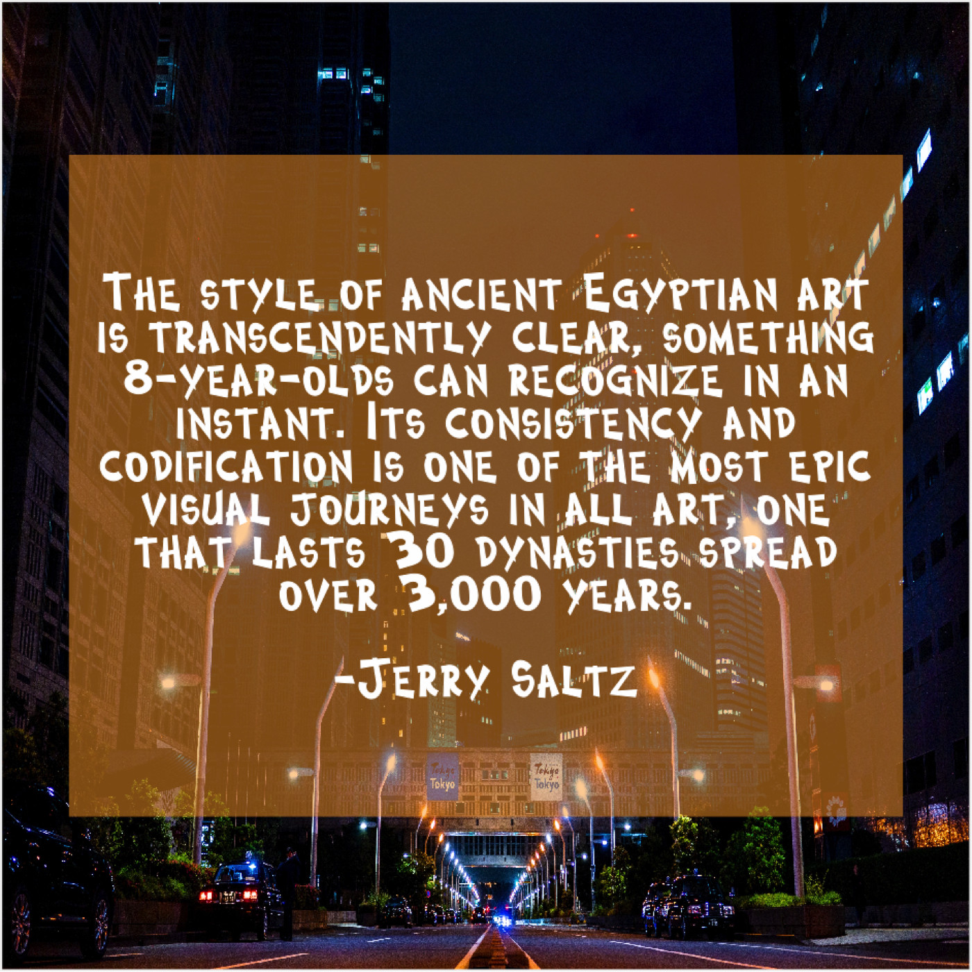 “The style of ancient Egyptian art is transcendently clear, something 8-year-olds can recognize in an instant. Its consistency and codification is one of the most epic visual journeys in all art, one that lasts 30 dynasties spread over 3,000 years.”