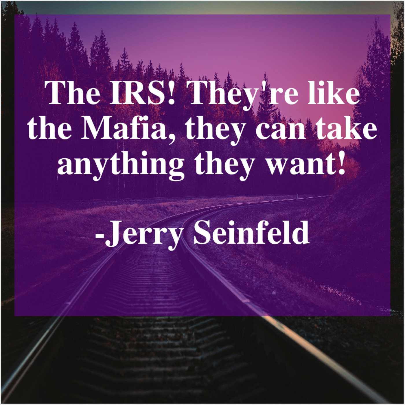 Jerry Seinfeld Jerry Seinfeld – The IRS! They’re like the… March 16, 2019 admin “The IRS! They’re like the Mafia, they can take anything they want!”-Jerry Seinfeld