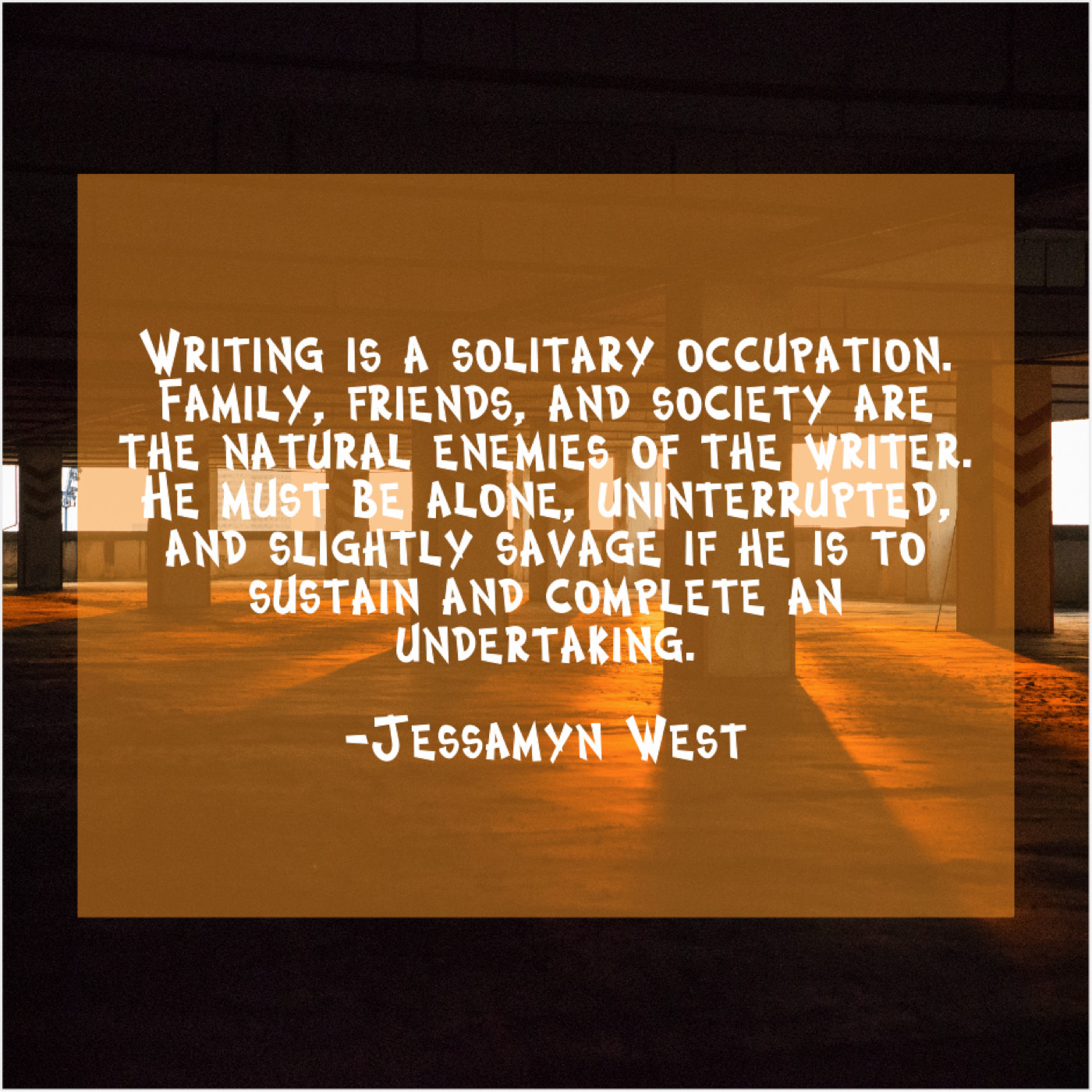 Jessamyn West Jessamyn West – Writing is a solitary occupation… March 24, 2019 admin “Writing is a solitary occupation. Family, friends, and society are the natural enemies of the writer. He must be alone, uninterrupted, and slightly savage if he is to sustain and complete an undertaking.”-Jessamyn West