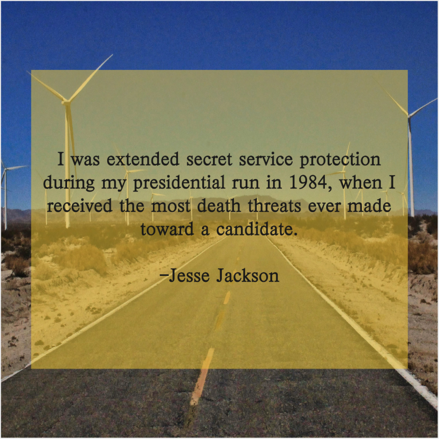 Jesse Jackson Jesse Jackson – I was extended secret service… August 30, 2019 admin “I was extended secret service protection during my presidential run in 1984, when I received the most death threats ever made toward a candidate.”-Jesse Jackson