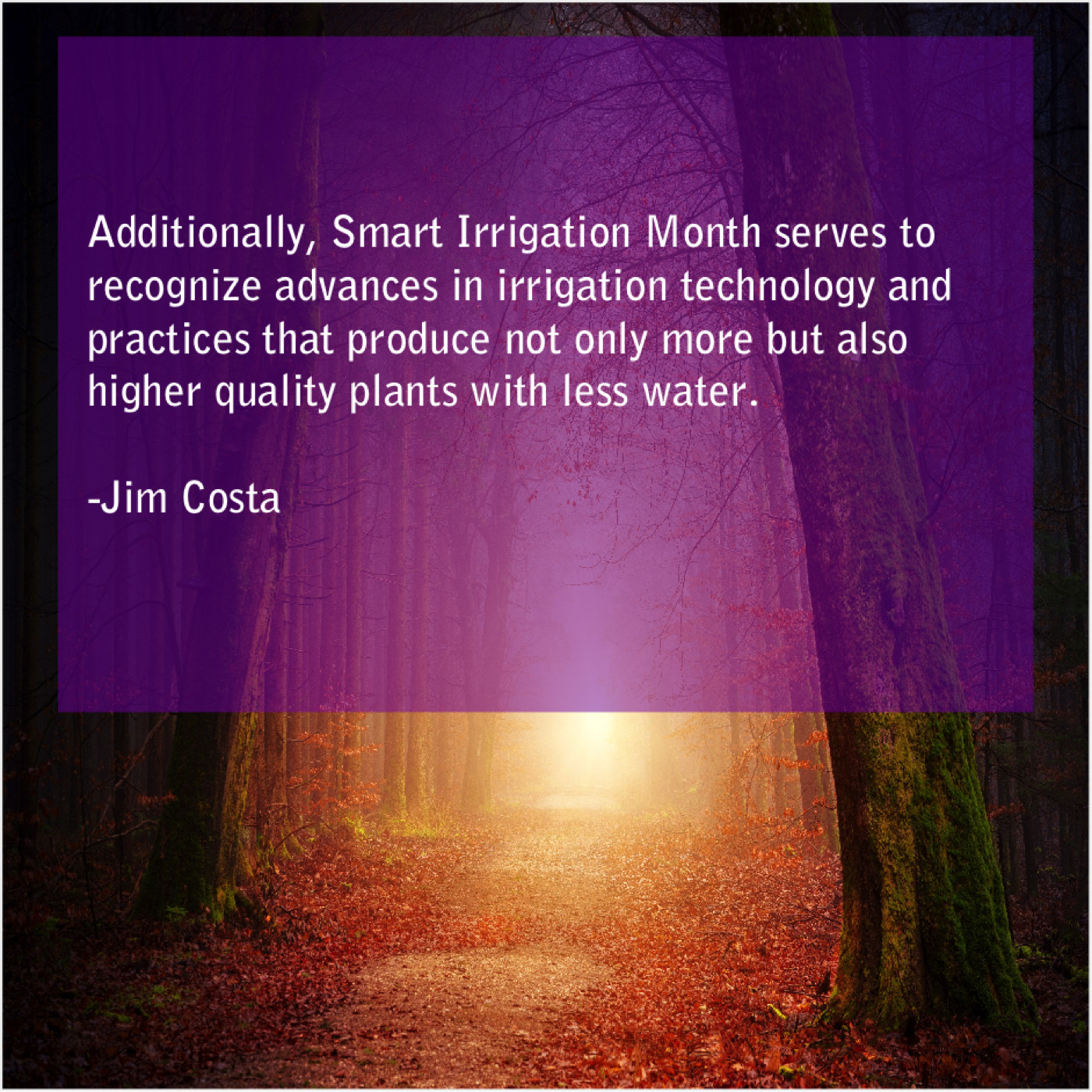 Jim Costa Jim Costa – Additionally, Smart Irrigation Month serves… October 12, 2019 admin “Additionally, Smart Irrigation Month serves to recognize advances in irrigation technology and practices that produce not only more but also higher quality plants with less water.”-Jim Costa