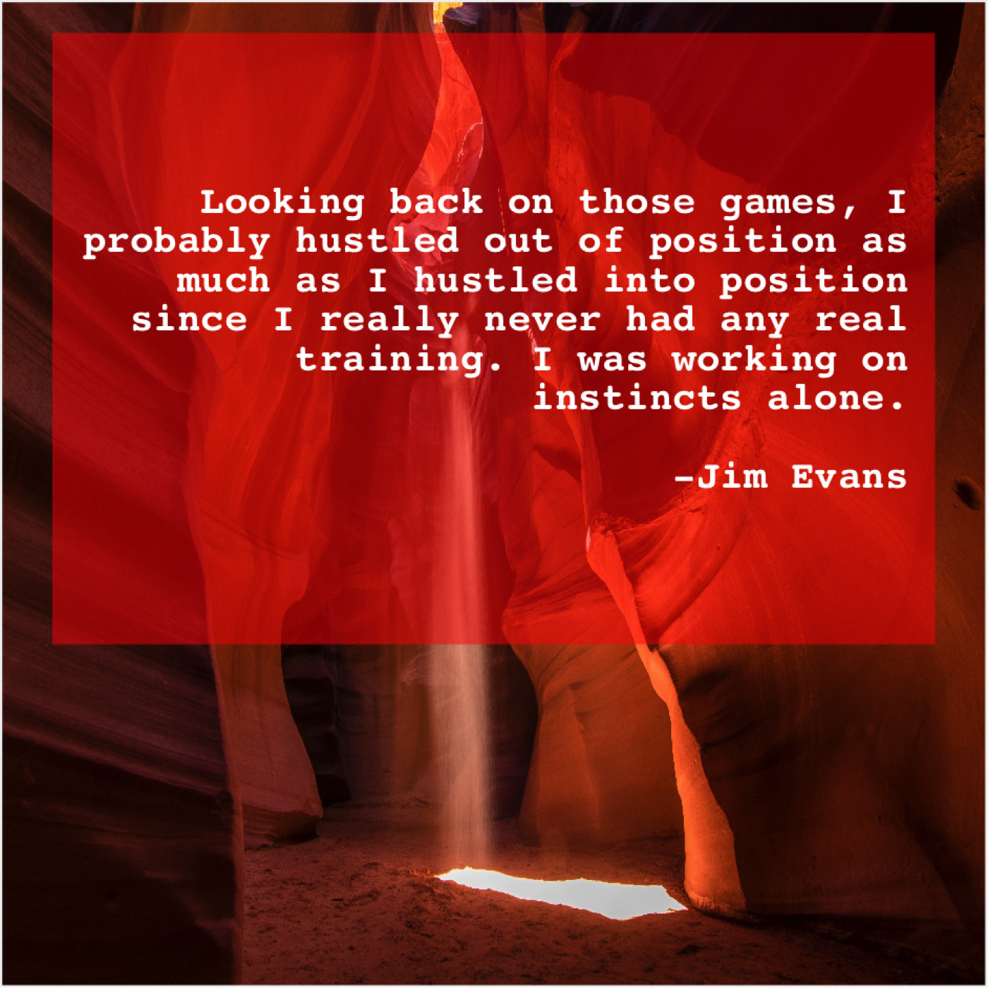 Jim Evans Jim Evans – Looking back on those games… October 5, 2019 admin “Looking back on those games, I probably hustled out of position as much as I hustled into position since I really never had any real training. I was working on instincts alone.”-Jim Evans