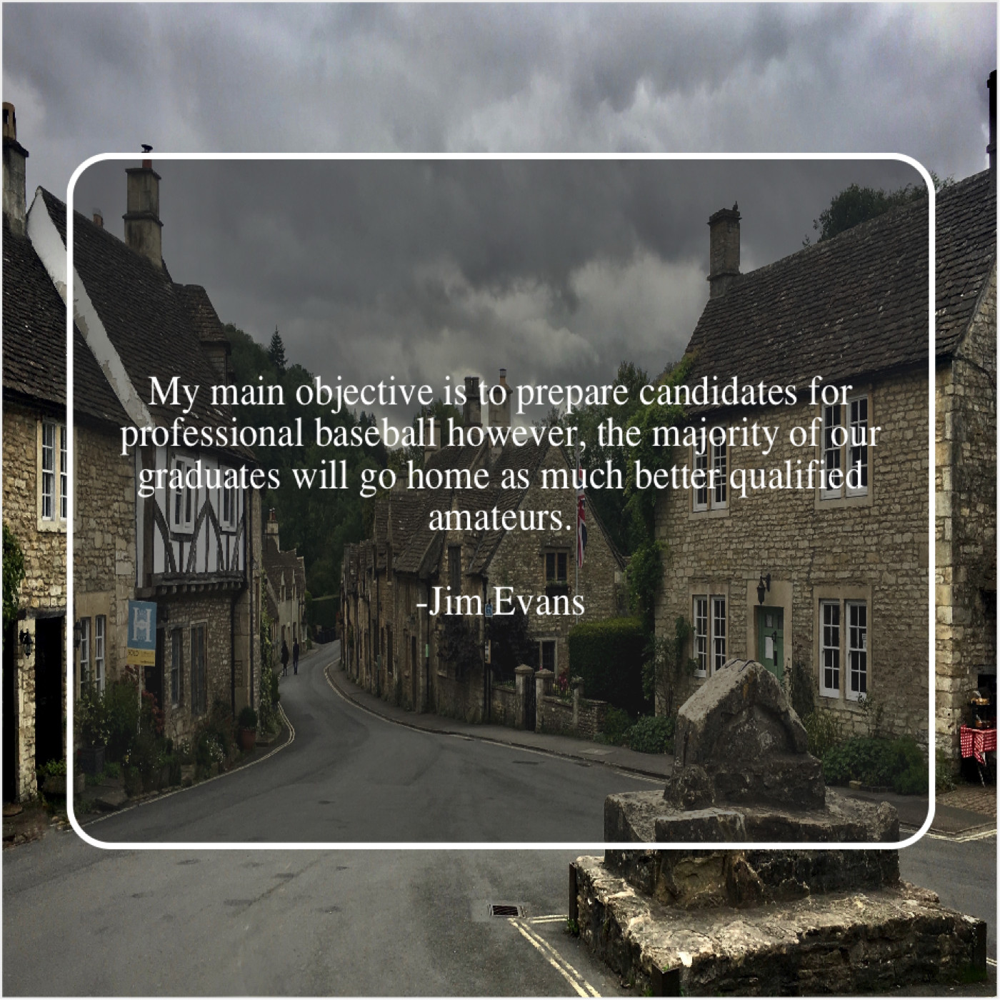 Jim Evans Jim Evans – My main objective is to… July 10, 2019 admin “My main objective is to prepare candidates for professional baseball however, the majority of our graduates will go home as much better qualified amateurs.”-Jim Evans