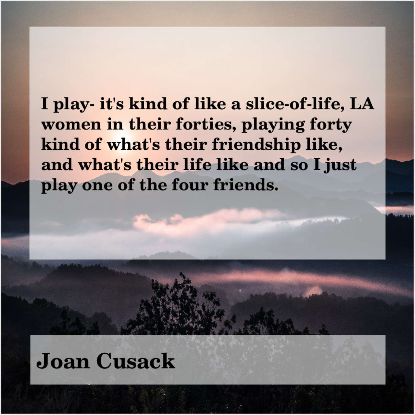 Joan Cusack Joan Cusack – I play- it’s kind of… August 18, 2019 admin “I play- it’s kind of like a slice-of-life, LA women in their forties, playing forty kind of what’s their friendship like, and what’s their life like and so I just play one of the four friends.”-Joan Cusack
