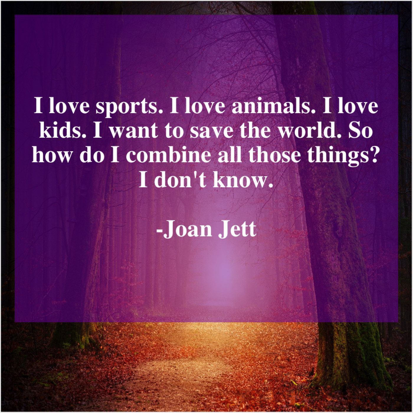 Joan Jett Joan Jett – I love sports. I love… February 21, 2019 admin “I love sports. I love animals. I love kids. I want to save the world. So how do I combine all those things? I don’t know.”-Joan Jett