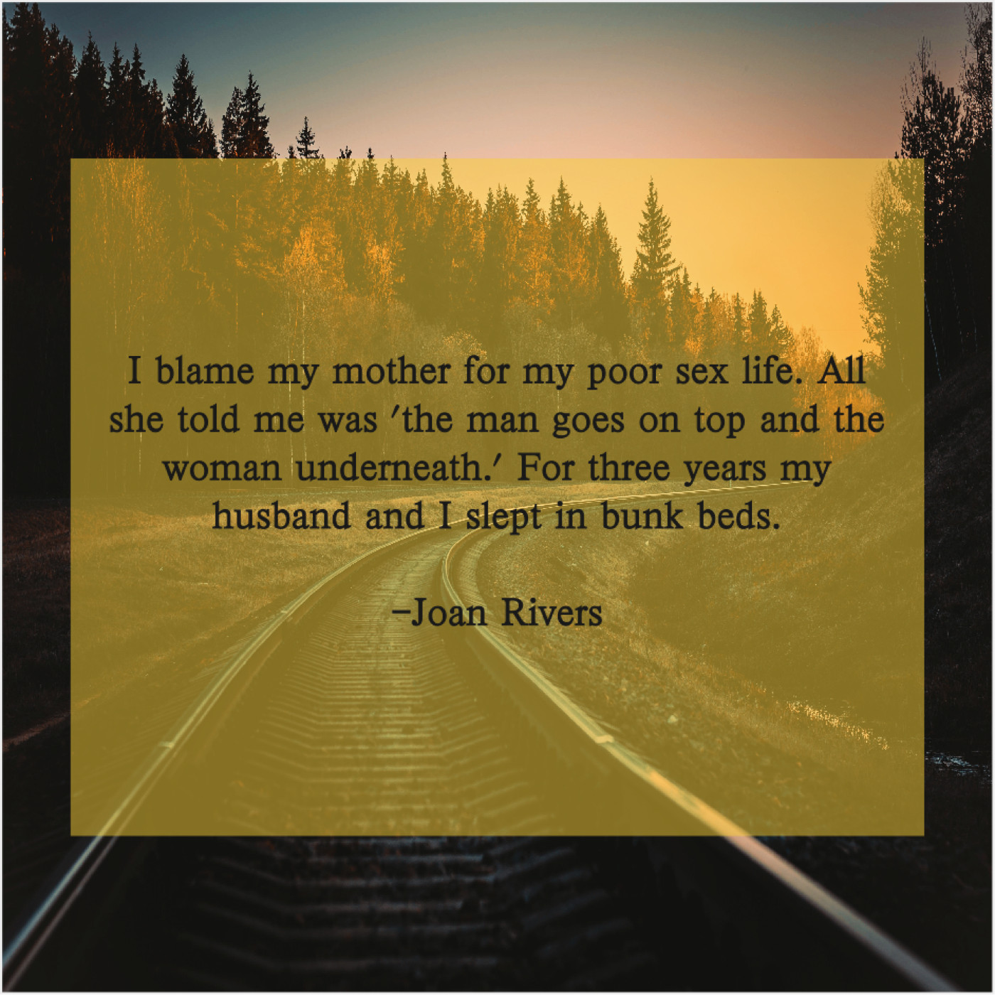 Joan Rivers Joan Rivers – I blame my mother for… June 16, 2019 admin “I blame my mother for my poor sex life. All she told me was ‘the man goes on top and the woman underneath.’ For three years my husband and I slept in bunk beds.”-Joan Rivers
