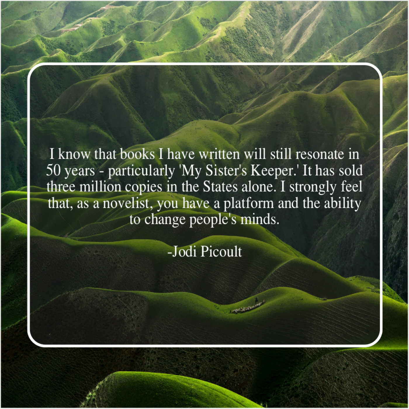 “I know that books I have written will still resonate in 50 years – particularly ‘My Sister’s Keeper.’ It has sold three million copies in the States alone. I strongly feel that, as a novelist, you have a platform and the ability to change people’s minds.”