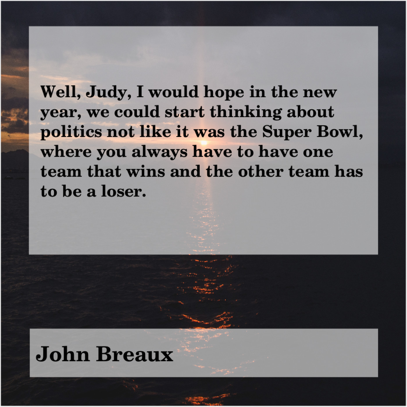 John Breaux John Breaux – Well, Judy, I would hope… January 13, 2019 admin “Well, Judy, I would hope in the new year, we could start thinking about politics not like it was the Super Bowl, where you always have to have one team that wins and the other team has to be a loser.”-John Breaux