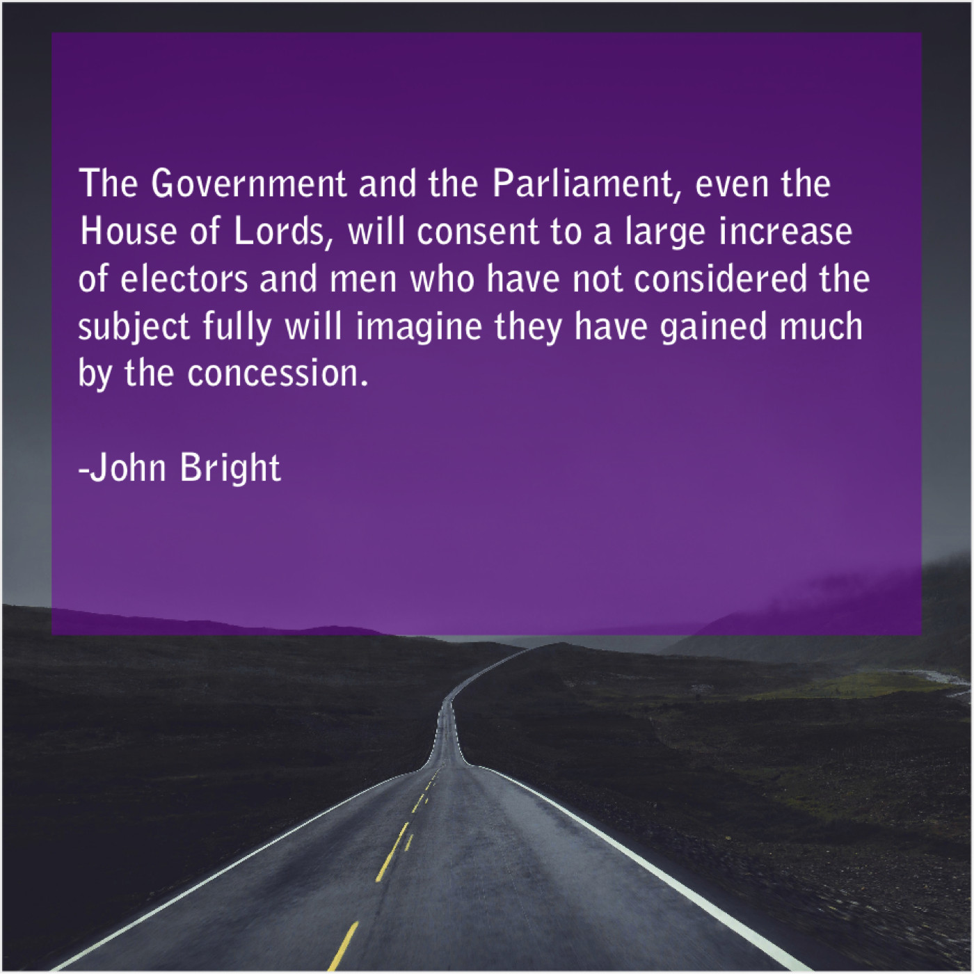 John Bright John Bright – The Government and the Parliament… January 25, 2019 admin “The Government and the Parliament, even the House of Lords, will consent to a large increase of electors and men who have not considered the subject fully will imagine they have gained much by the concession.”-John Bright