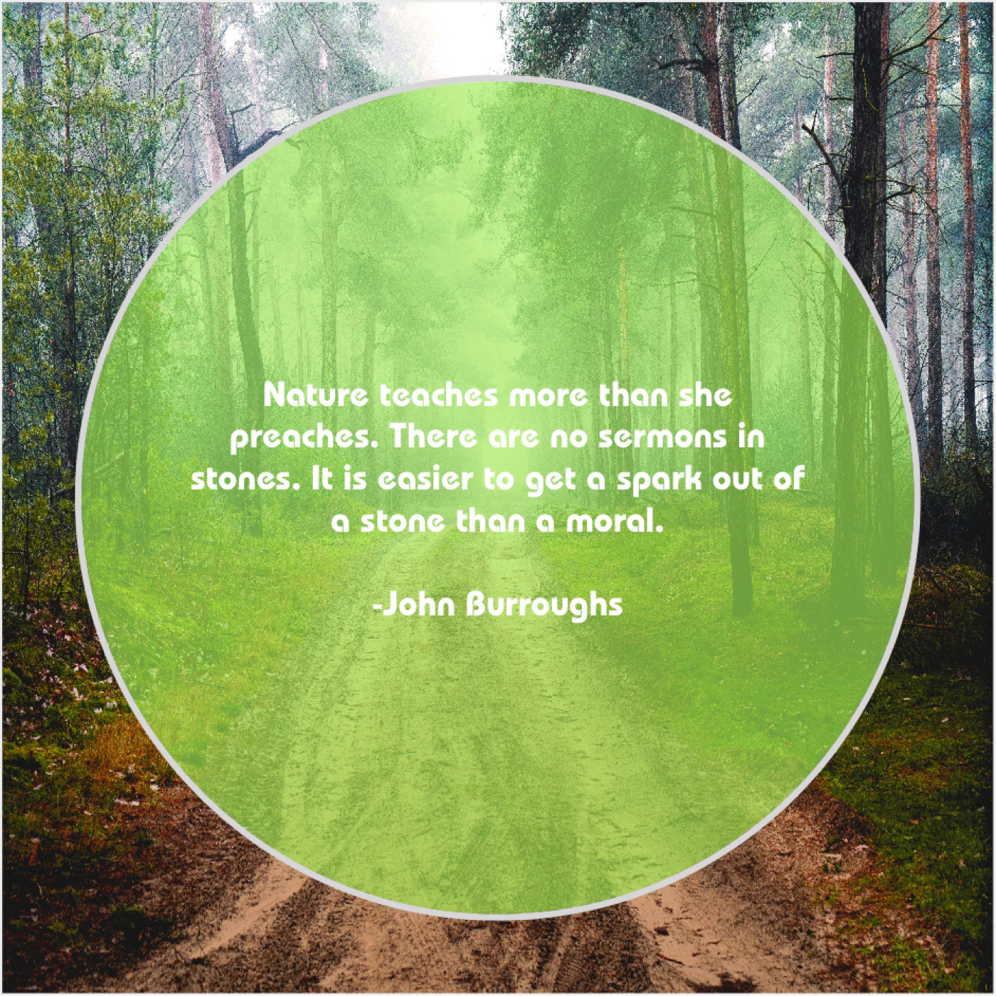 John Burroughs John Burroughs – Nature teaches more than she… June 7, 2019 admin “Nature teaches more than she preaches. There are no sermons in stones. It is easier to get a spark out of a stone than a moral.”-John Burroughs