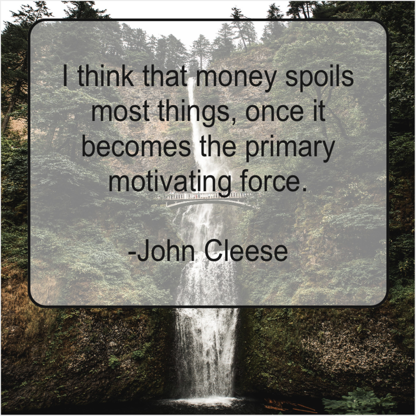 John Cleese John Cleese – I think that money spoils… October 18, 2019 admin “I think that money spoils most things, once it becomes the primary motivating force.”-John Cleese