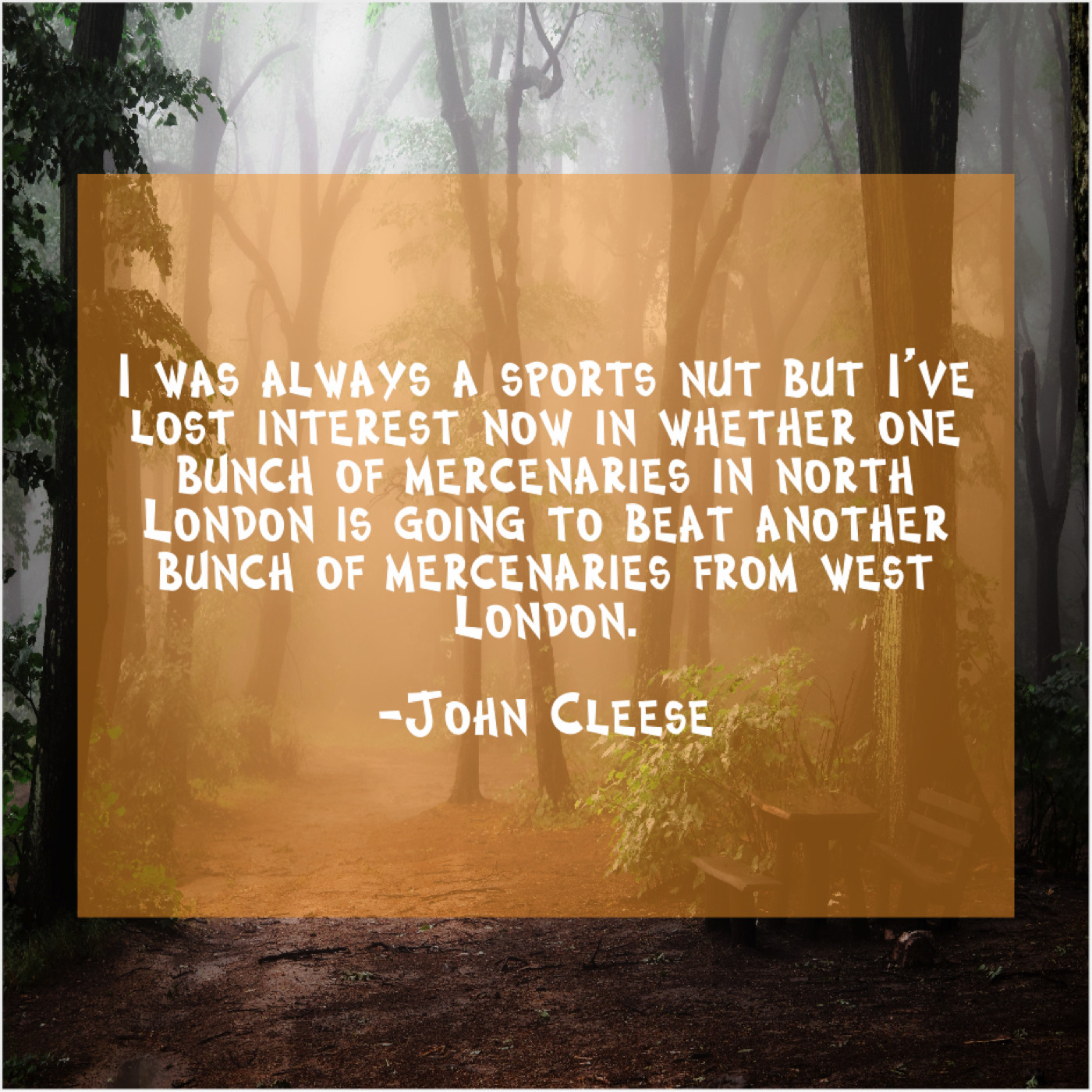 John Cleese John Cleese – I was always a sports… May 24, 2019 admin “I was always a sports nut but I’ve lost interest now in whether one bunch of mercenaries in north London is going to beat another bunch of mercenaries from west London.”-John Cleese