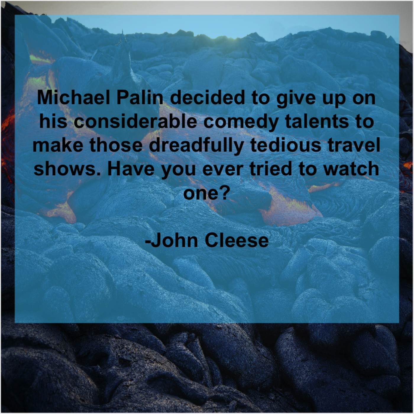 John Cleese John Cleese – Michael Palin decided to give… April 8, 2019 admin “Michael Palin decided to give up on his considerable comedy talents to make those dreadfully tedious travel shows. Have you ever tried to watch one?”-John Cleese