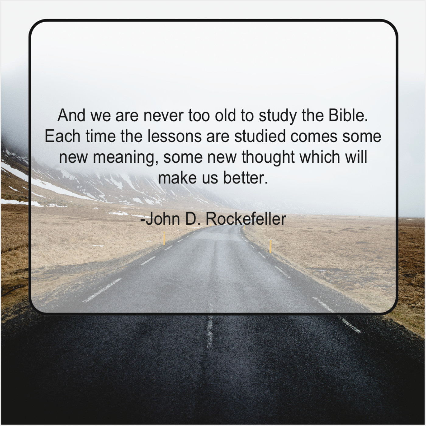 John D. Rockefeller John D. Rockefeller – And we are never too… April 28, 2019 admin “And we are never too old to study the Bible. Each time the lessons are studied comes some new meaning, some new thought which will make us better.”-John D. Rockefeller