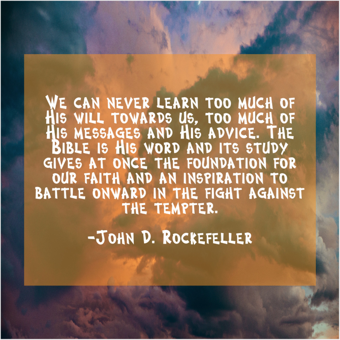 “We can never learn too much of His will towards us, too much of His messages and His advice. The Bible is His word and its study gives at once the foundation for our faith and an inspiration to battle onward in the fight against the tempter.”