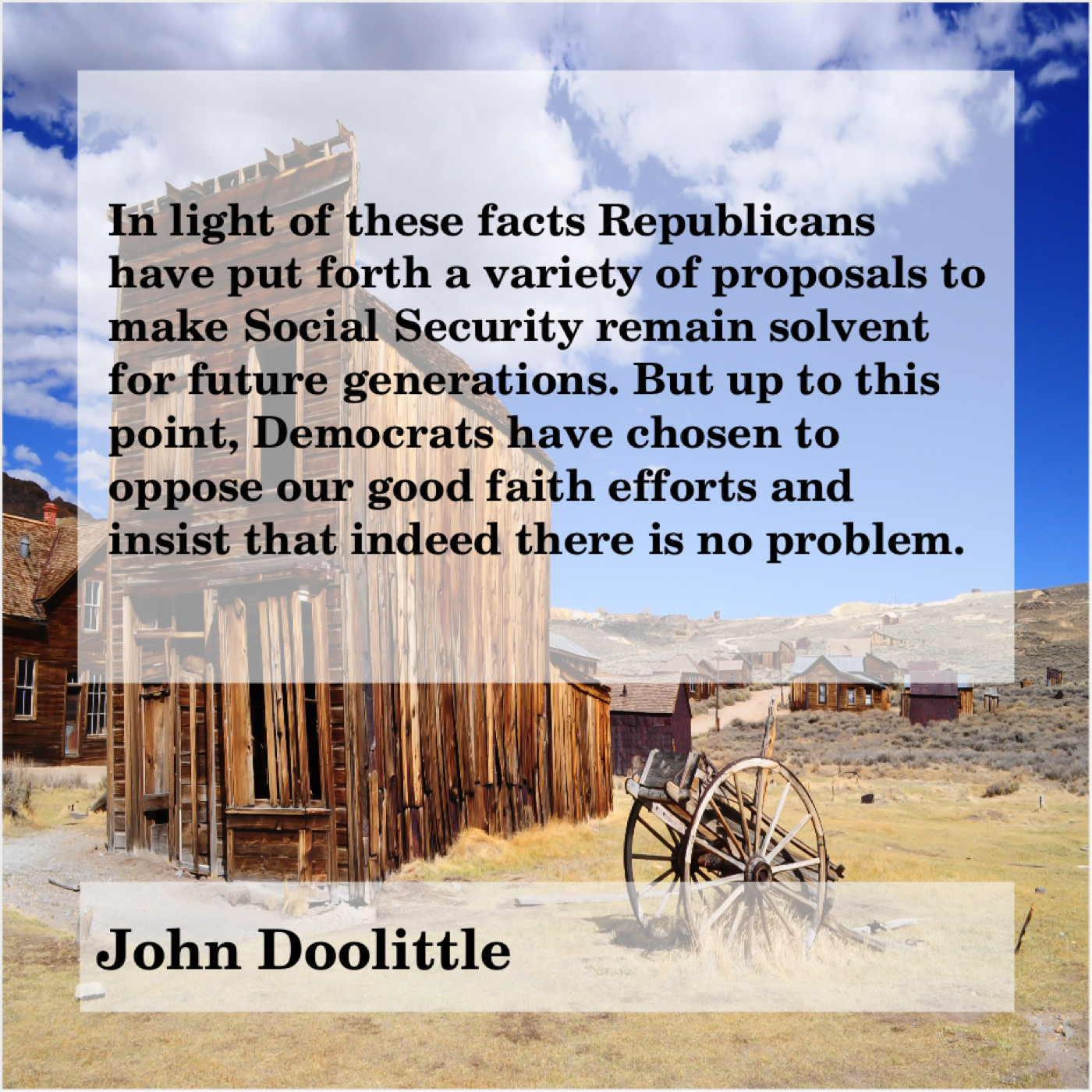“In light of these facts Republicans have put forth a variety of proposals to make Social Security remain solvent for future generations. But up to this point, Democrats have chosen to oppose our good faith efforts and insist that indeed there is no problem.”