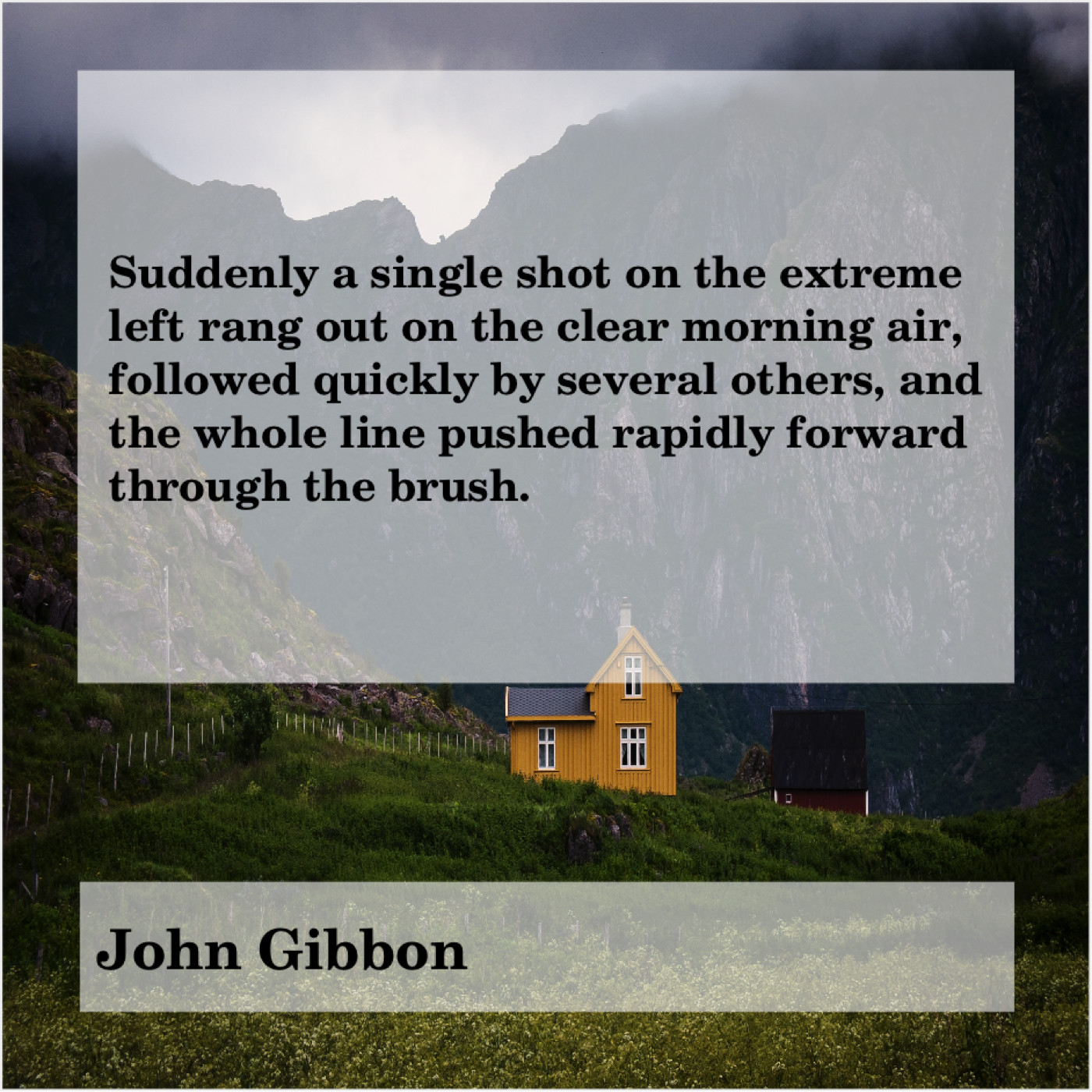 John Gibbon John Gibbon – Suddenly a single shot on… February 14, 2019 admin “Suddenly a single shot on the extreme left rang out on the clear morning air, followed quickly by several others, and the whole line pushed rapidly forward through the brush.”-John Gibbon