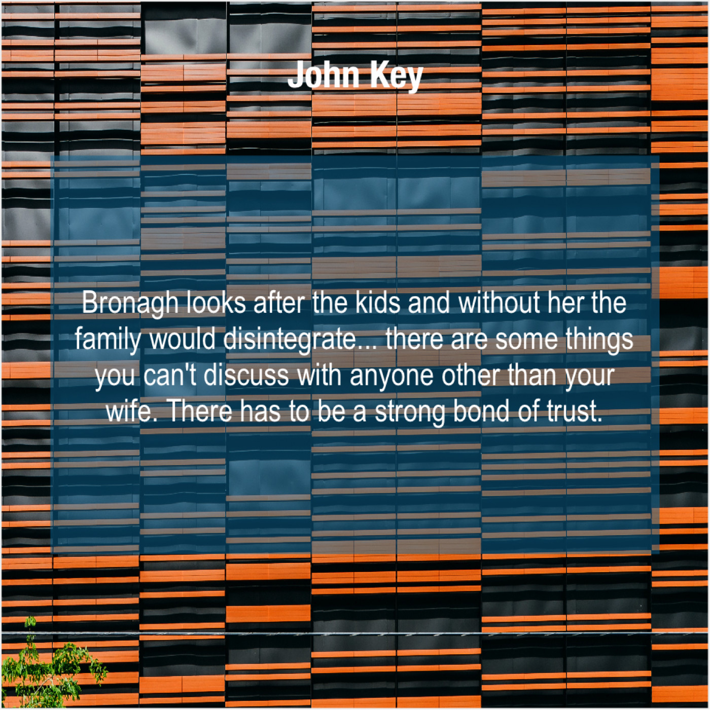 John Key John Key – Bronagh looks after the kids… April 12, 2019 admin “Bronagh looks after the kids and without her the family would disintegrate… there are some things you can’t discuss with anyone other than your wife. There has to be a strong bond of trust.”-John Key