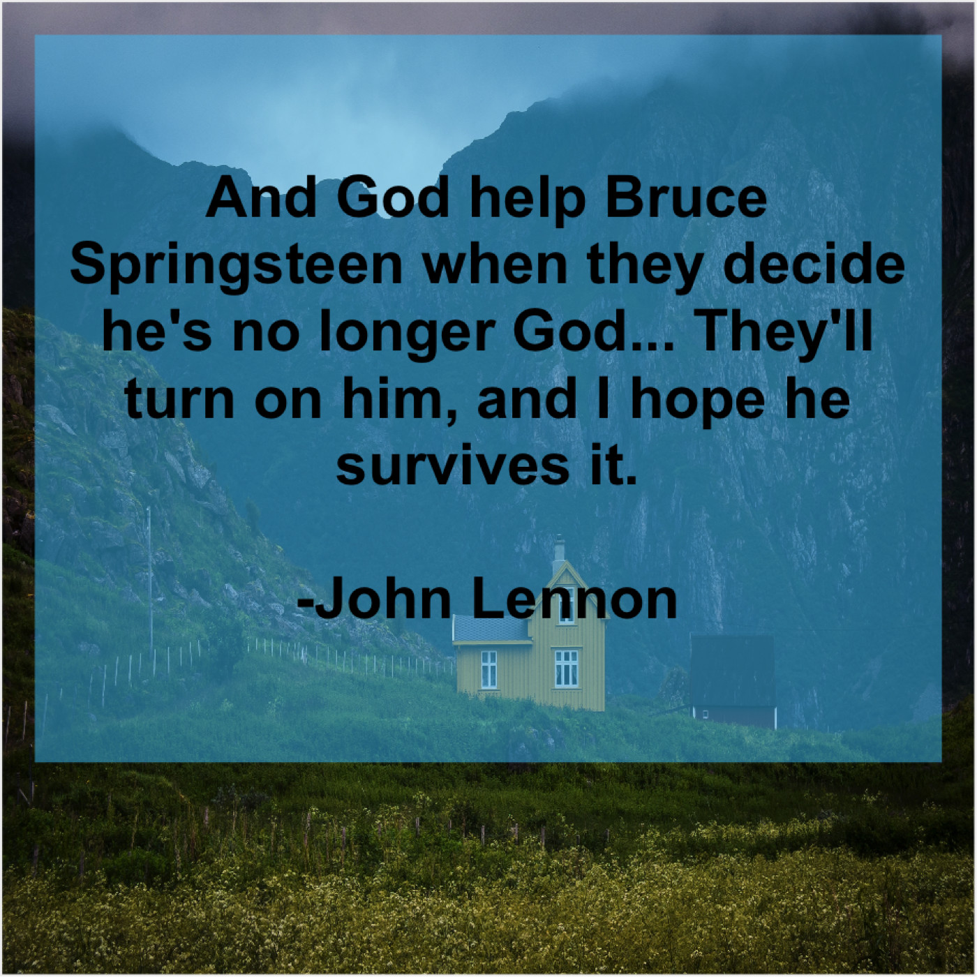 John Lennon John Lennon – And God help Bruce Springsteen… April 29, 2019 admin “And God help Bruce Springsteen when they decide he’s no longer God… They’ll turn on him, and I hope he survives it.”-John Lennon