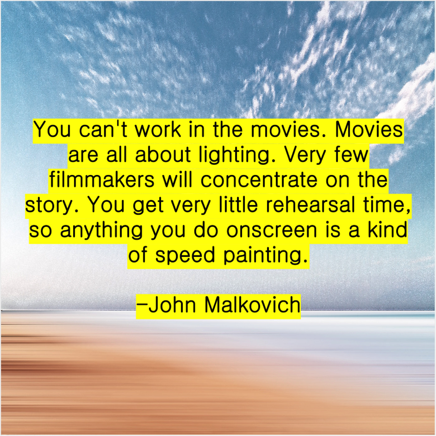 John Malkovich John Malkovich – You can’t work in the… September 29, 2019 admin “You can’t work in the movies. Movies are all about lighting. Very few filmmakers will concentrate on the story. You get very little rehearsal time, so anything you do onscreen is a kind of speed painting.”-John Malkovich