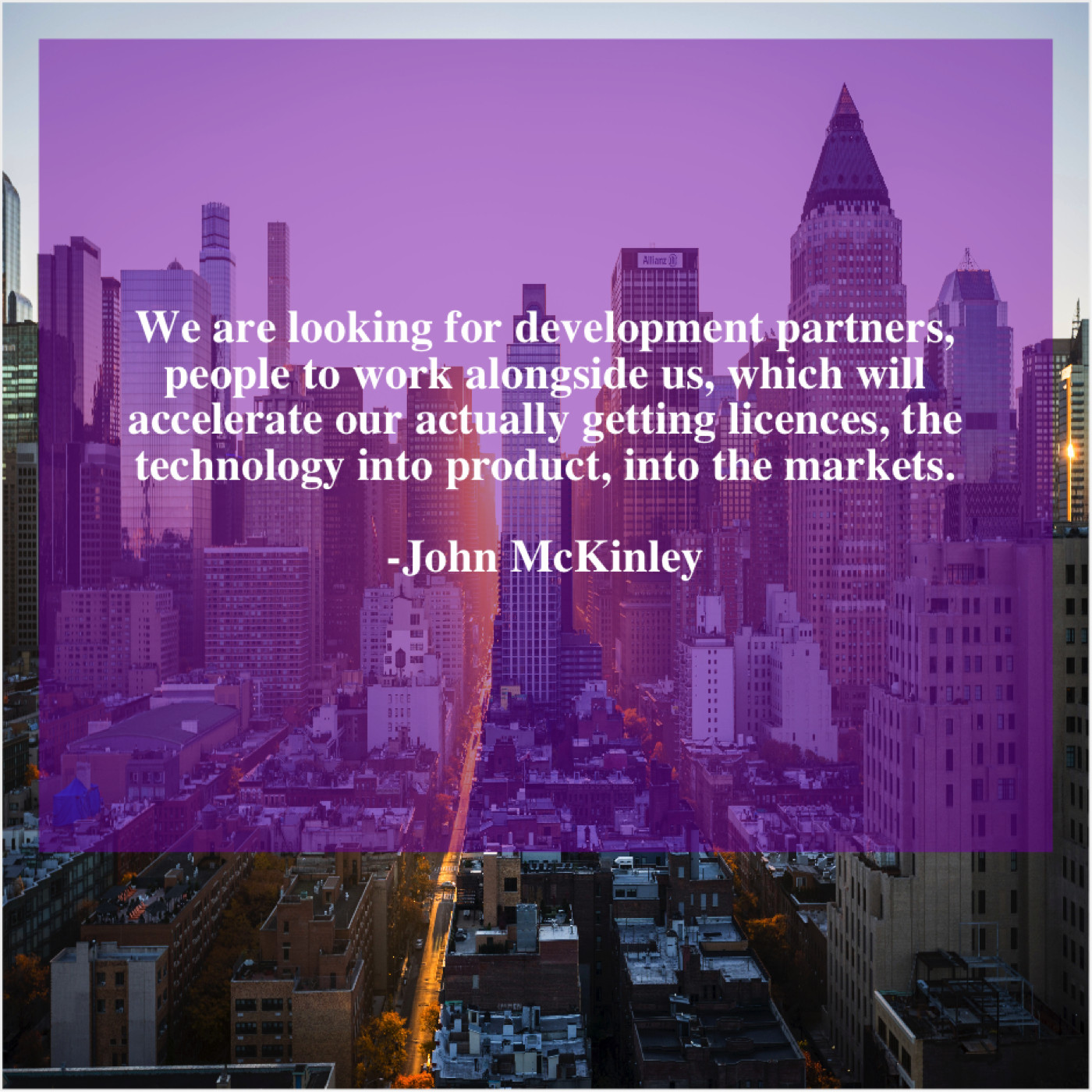 John McKinley John McKinley – We are looking for development… December 8, 2018 admin “We are looking for development partners, people to work alongside us, which will accelerate our actually getting licences, the technology into product, into the markets.”-John McKinley